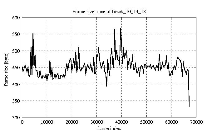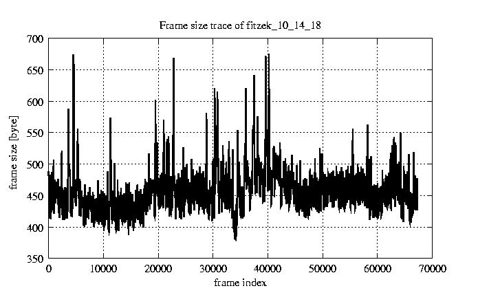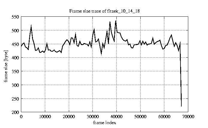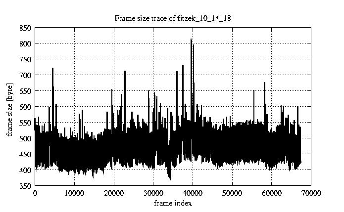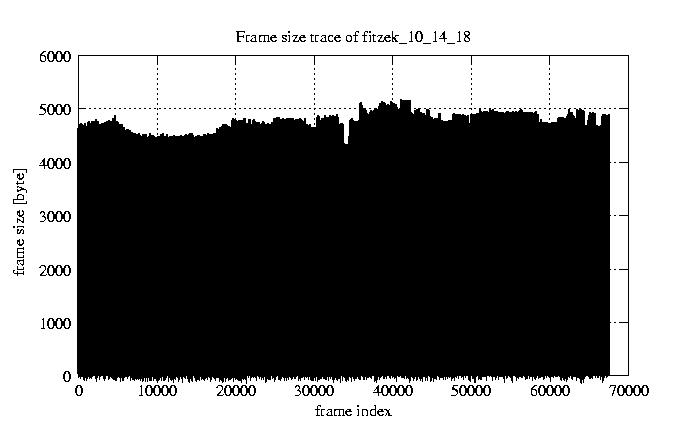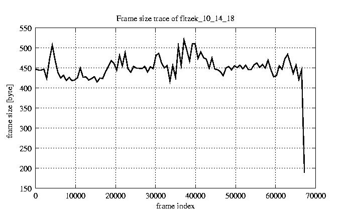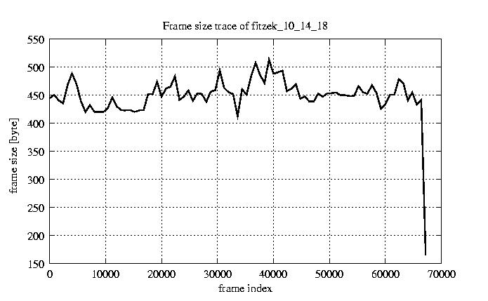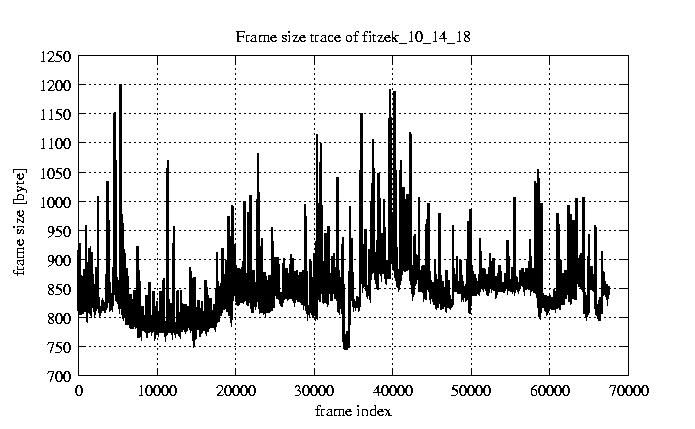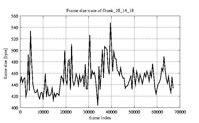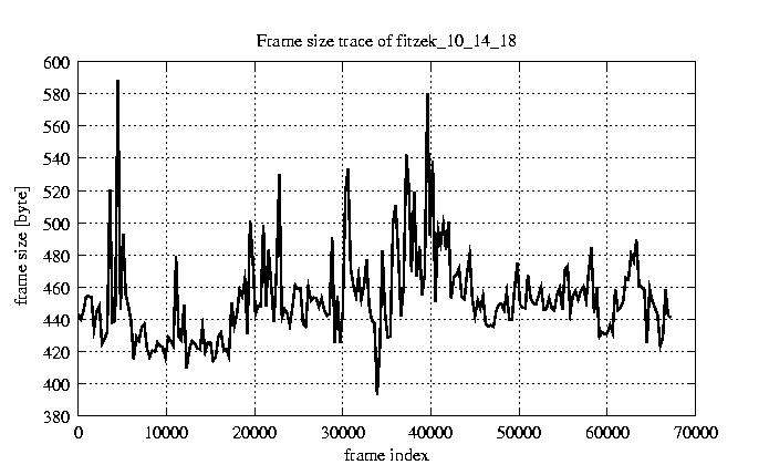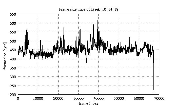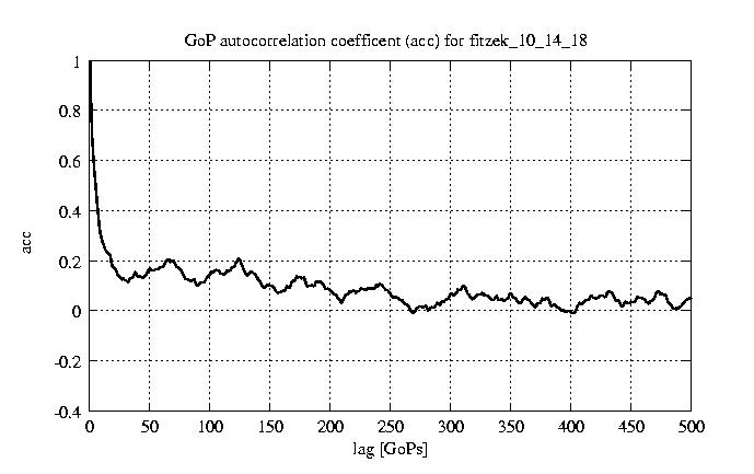 GoP statistics # of GoPs - 5624 mean GoP size byte 5.4e+03 var GoP size - 2.4e+05 CoV of GoP size - 0.09 min GoP size byte 4666 max GoP size byte 9749 Mean bit rate bit/sec 9e+04 Peak bit rate bit/sec 1.6e+05 Peak/Mean of bit rate - 1.80