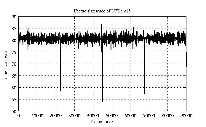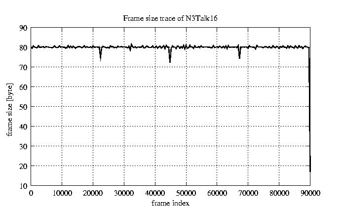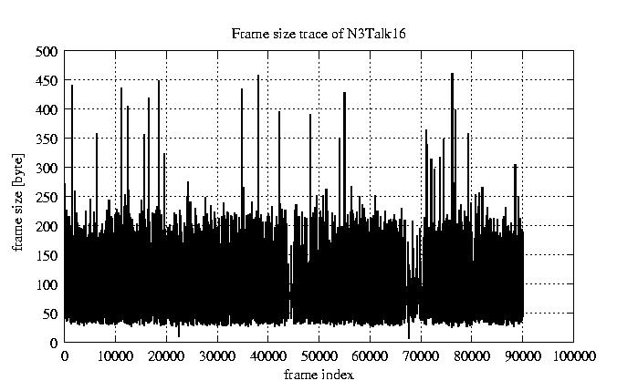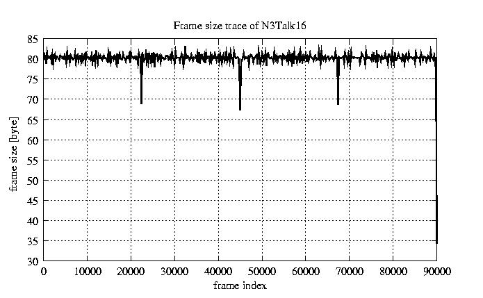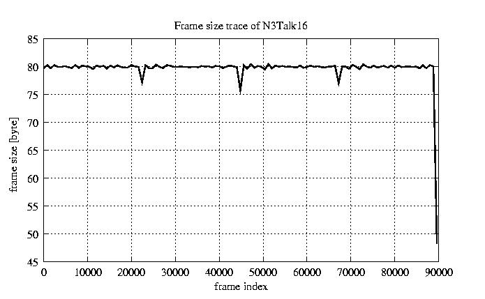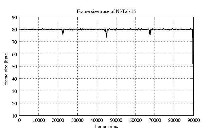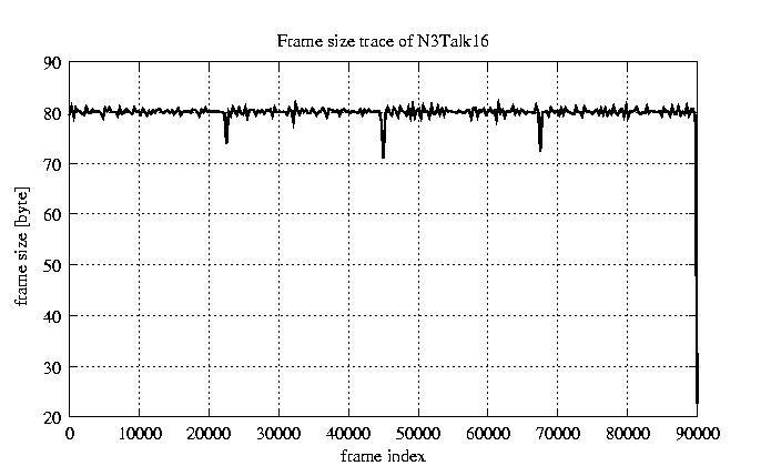 Frames, stuffed Rates Frames, original compression ratio YUV:H263 476.45 476.45 File size byte 7.2e+06 7.2e+06 Video run time msec 3.6e+06 3.6e+06 3.6e+06 # of Frames - 90085.00 21371.00 mean frame size byte 79.79 336.35 var frame size - 28547.69 34044.96 CoV of frame size - 2.12 0.55 min frame size byte 0.00 51.00 max frame size byte 4063.00 4063.00 Peak/Mean frame - 50.92 12.08 Mean bit rate bit/sec 1.6e+04 Peak bit rate bit/sec 9.2e+04 Peak/Mean of bit rate - 5.8 CoV of bit rate - 0.38 max inter frame space frames 1.00 59.00