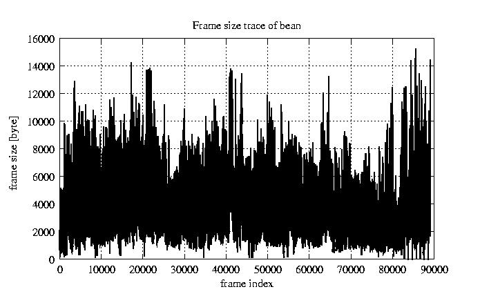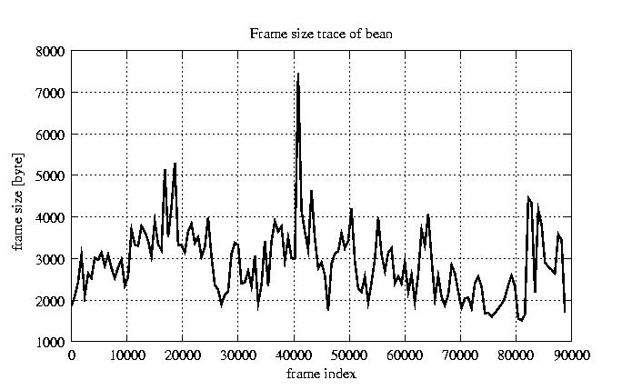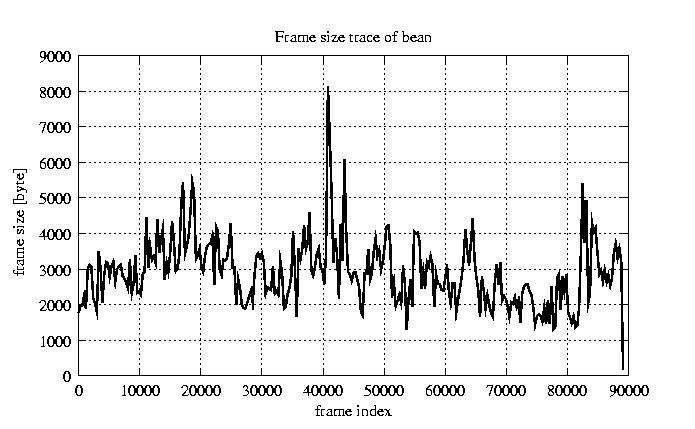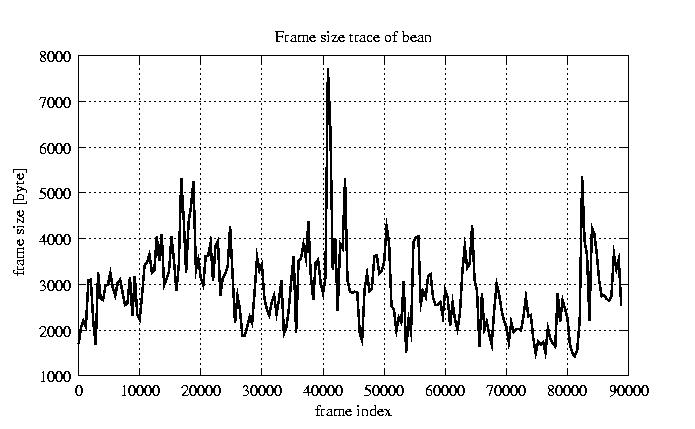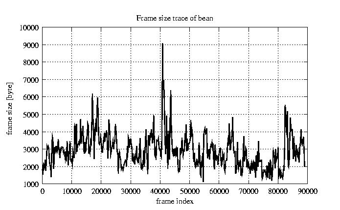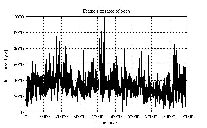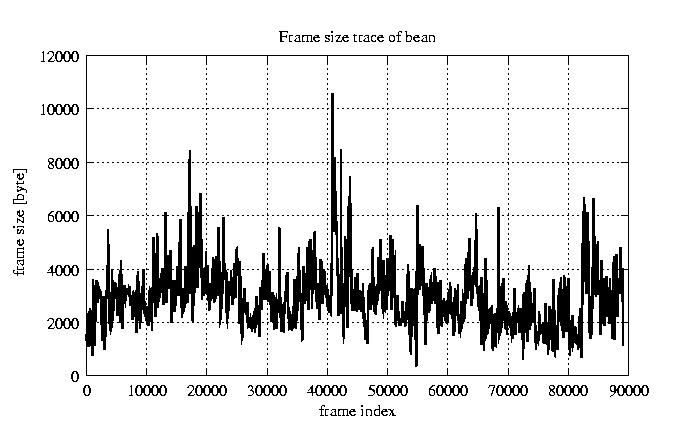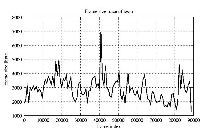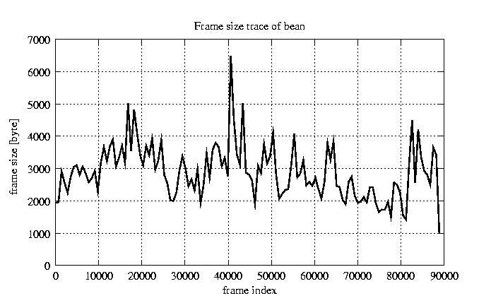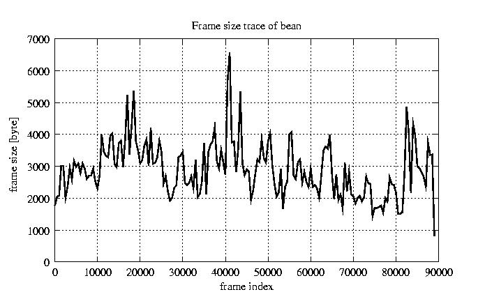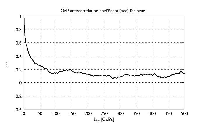 GoP statistics # of GoPs - 7426 mean GoP size byte 3.5e+04 var GoP size - 2e+08 CoV of GoP size - 0.40 min GoP size byte 2294 max GoP size byte 130332 Mean bit rate bit/sec 5.8e+05 Peak bit rate bit/sec 2.2e+06 Peak/Mean of bit rate - 3.73