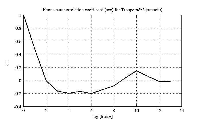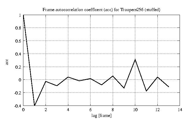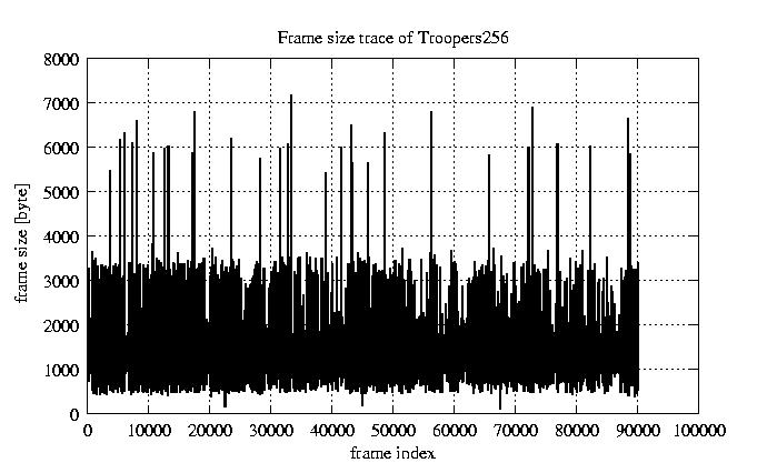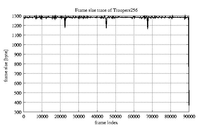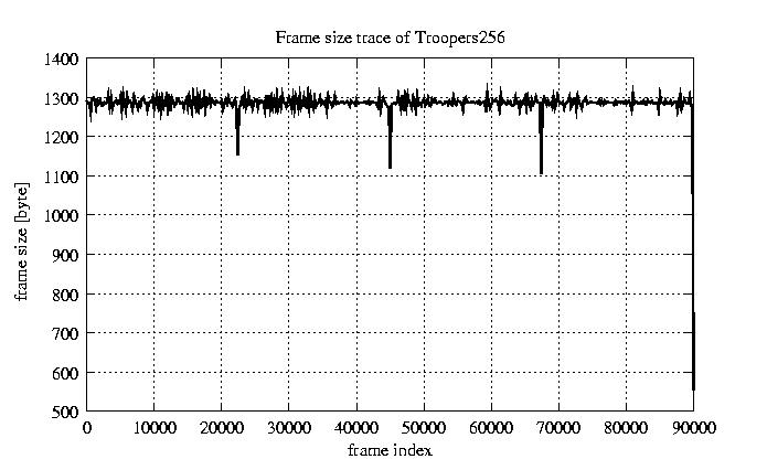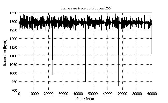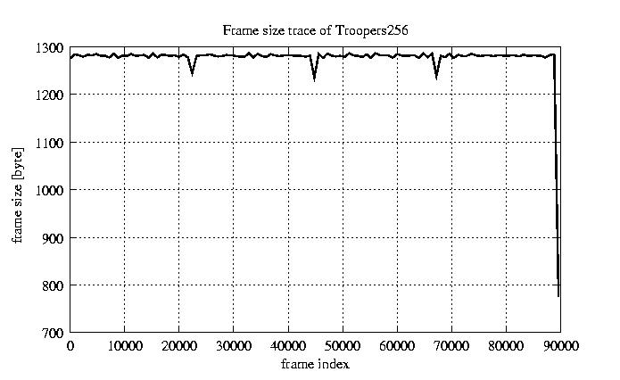 Frames, stuffed Rates Frames, original compression ratio YUV:H263 29.73 29.73 File size byte 1.2e+08 1.2e+08 Video run time msec 3.6e+06 3.6e+06 3.6e+06 # of Frames - 90085.00 29403.00 mean frame size byte 1278.80 3917.98 var frame size - 4017819.96 1969460.29 CoV of frame size - 1.57 0.36 min frame size byte 0.00 823.00 max frame size byte 10356.00 10356.00 Peak/Mean frame - 8.10 2.64 Mean bit rate bit/sec 2.6e+05 Peak bit rate bit/sec 1.4e+06 Peak/Mean of bit rate - 5.6 CoV of bit rate - 0.36 max inter frame space frames 1.00 33.00
