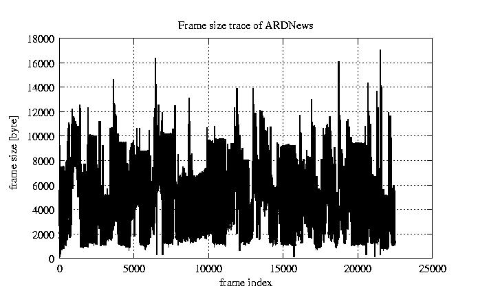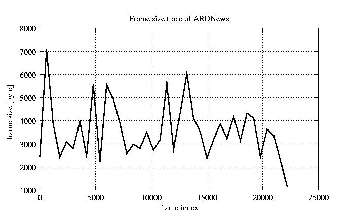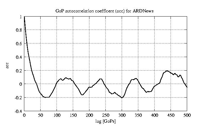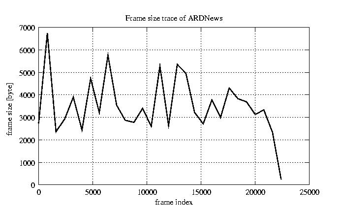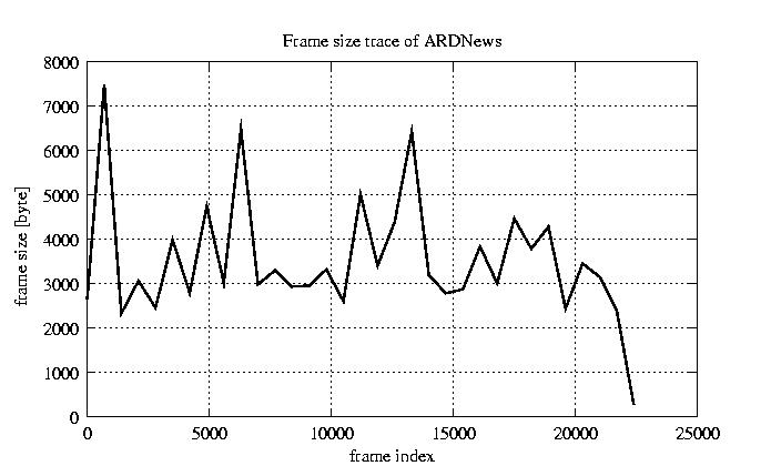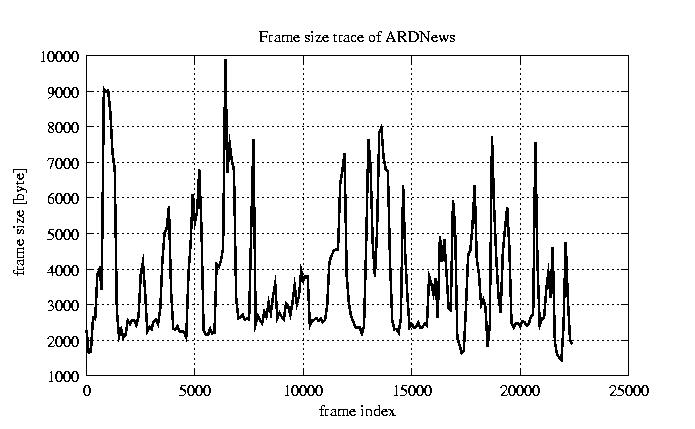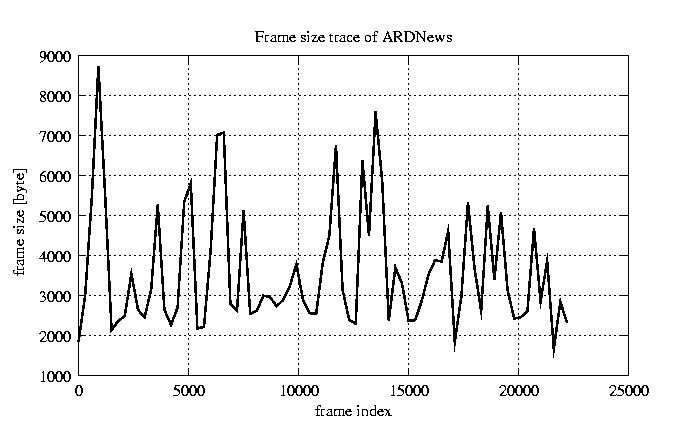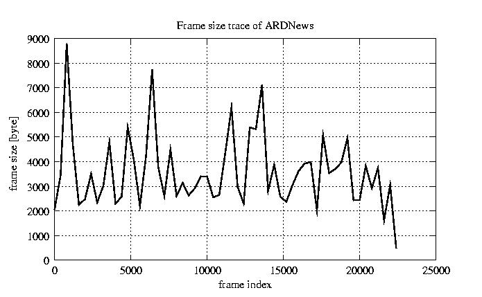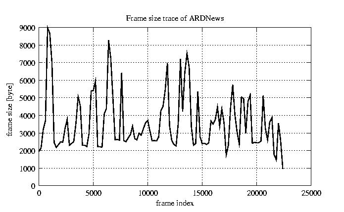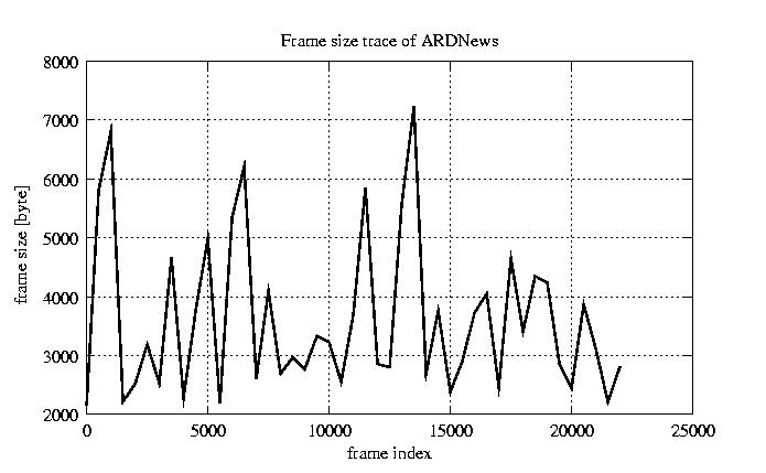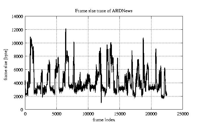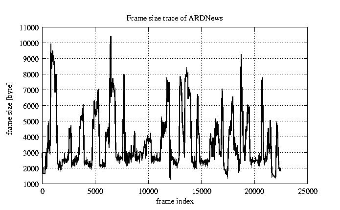 GoP statistics # of GoPs - 1874 mean GoP size byte 4.3e+04 var GoP size - 4.9e+08 CoV of GoP size - 0.51 min GoP size byte 10476 max GoP size byte 131905 Mean bit rate bit/sec 7.2e+05 Peak bit rate bit/sec 2.2e+06 Peak/Mean of bit rate - 3.04