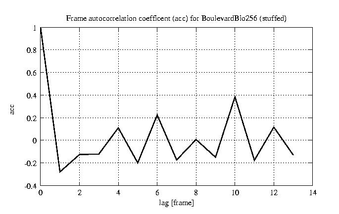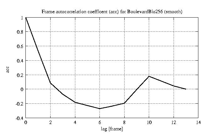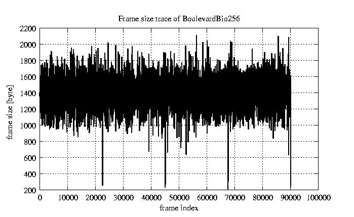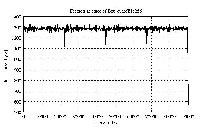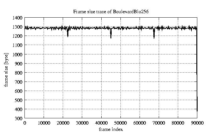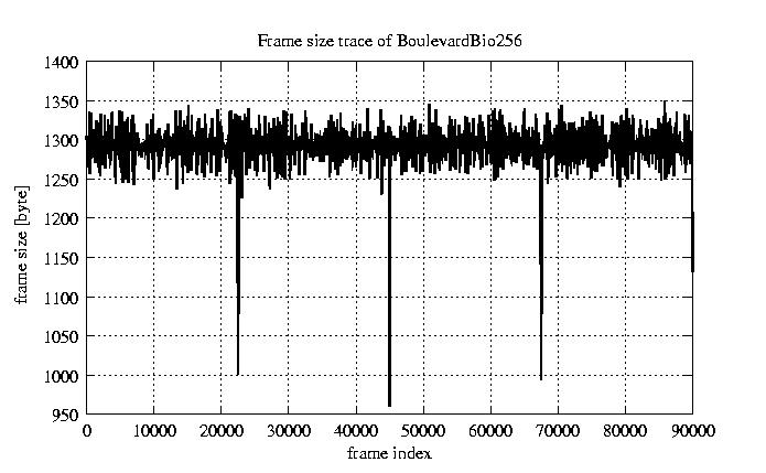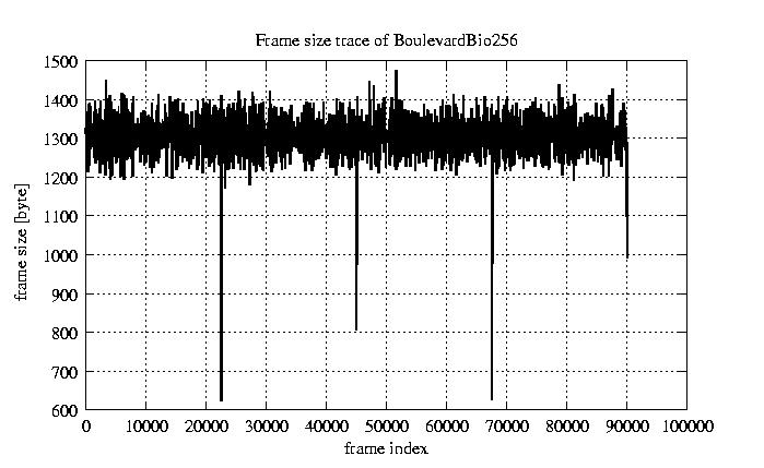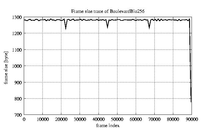 Frames, stuffed Rates Frames, original compression ratio YUV:H263 29.73 29.73 File size byte 1.2e+08 1.2e+08 Video run time msec 3.6e+06 3.6e+06 3.6e+06 # of Frames - 90085.00 21934.00 mean frame size byte 1278.77 5252.01 var frame size - 5826662.04 3062967.38 CoV of frame size - 1.89 0.33 min frame size byte 0.00 887.00 max frame size byte 11180.00 11180.00 Peak/Mean frame - 8.74 2.13 Mean bit rate bit/sec 2.6e+05 Peak bit rate bit/sec 1.5e+06 Peak/Mean of bit rate - 5.7 CoV of bit rate - 0.42 max inter frame space frames 1.00 32.00