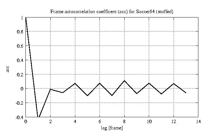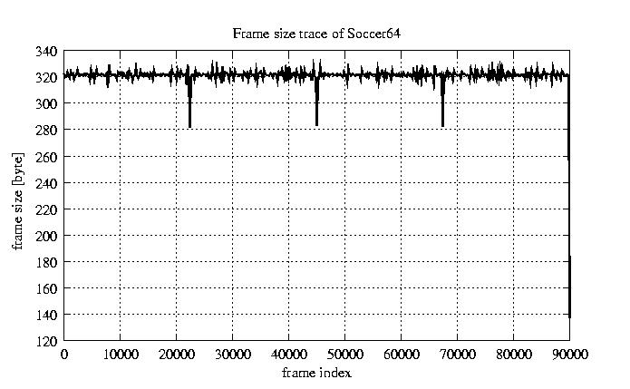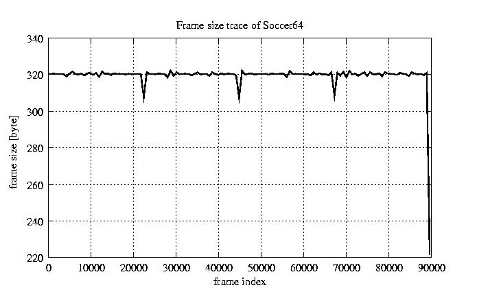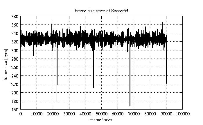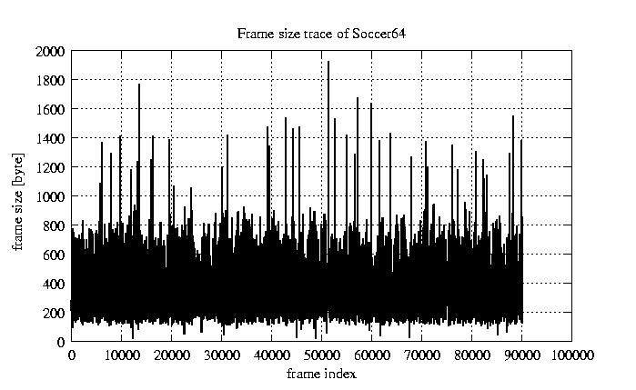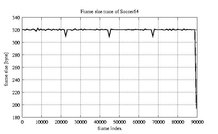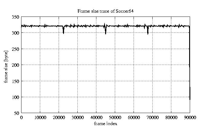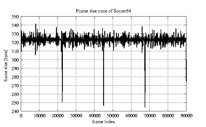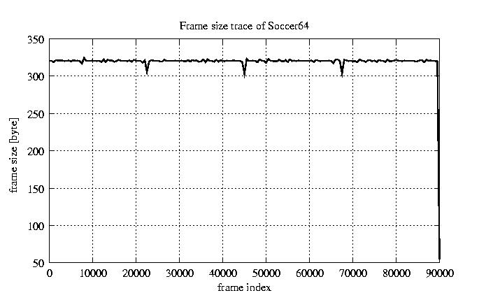 Frames, stuffed Rates Frames, original compression ratio YUV:H263 118.94 118.94 File size byte 2.9e+07 2.9e+07 Video run time msec 3.6e+06 3.6e+06 3.6e+06 # of Frames - 90084.00 31804.00 mean frame size byte 319.63 905.35 var frame size - 227282.62 113488.71 CoV of frame size - 1.49 0.37 min frame size byte 0.00 20.00 max frame size byte 4647.00 4647.00 Peak/Mean frame - 14.54 5.13 Mean bit rate bit/sec 6.4e+04 Peak bit rate bit/sec 3.9e+05 Peak/Mean of bit rate - 6 CoV of bit rate - 0.33 max inter frame space frames 1.00 30.00