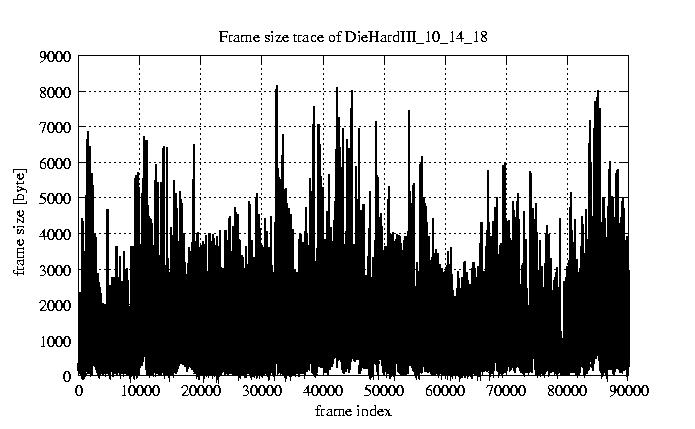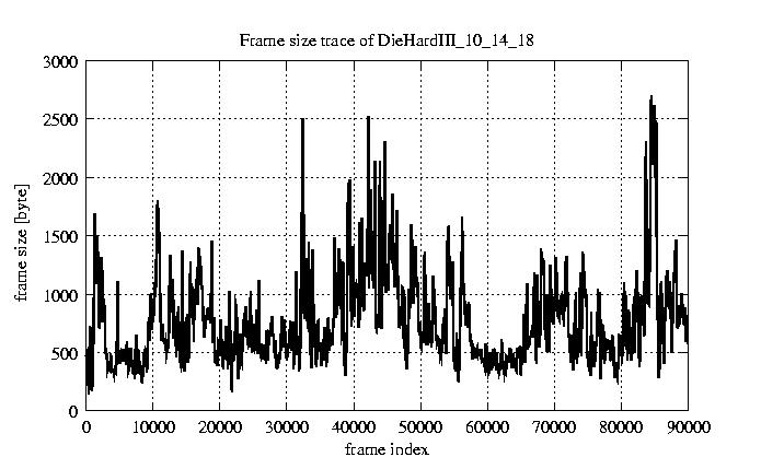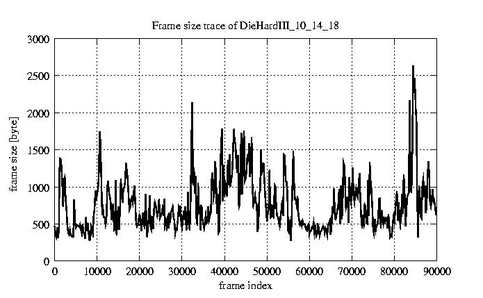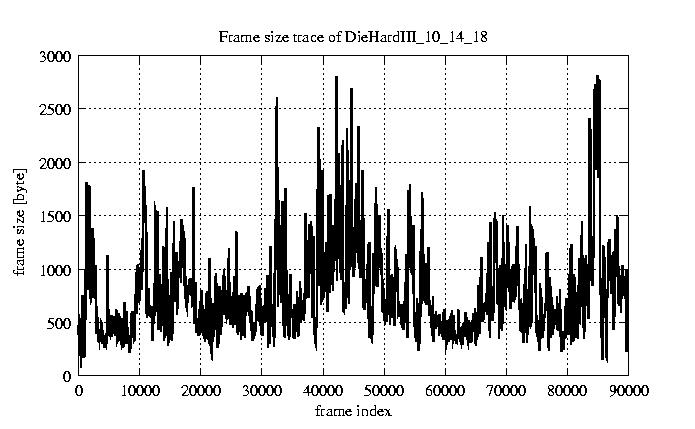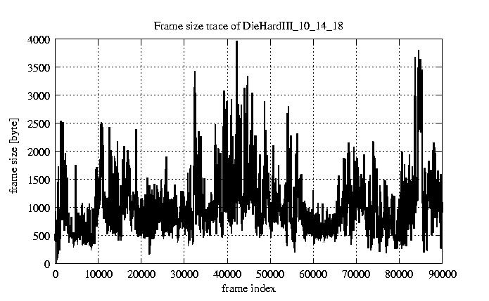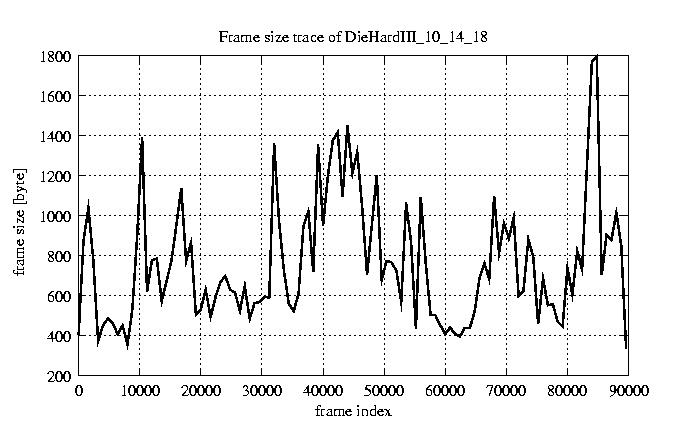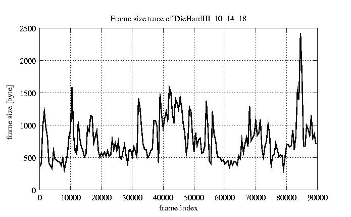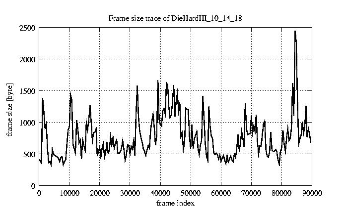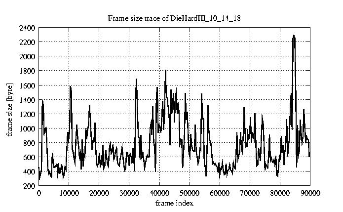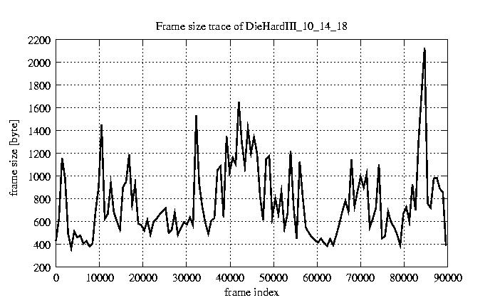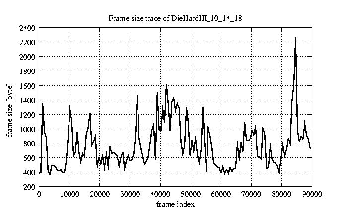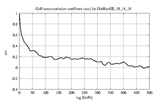 GoP statistics # of GoPs - 7499 mean GoP size byte 9.2e+03 var GoP size - 2.7e+07 CoV of GoP size - 0.56 min GoP size byte 799 max GoP size byte 39516 Mean bit rate bit/sec 1.5e+05 Peak bit rate bit/sec 6.6e+05 Peak/Mean of bit rate - 4.29