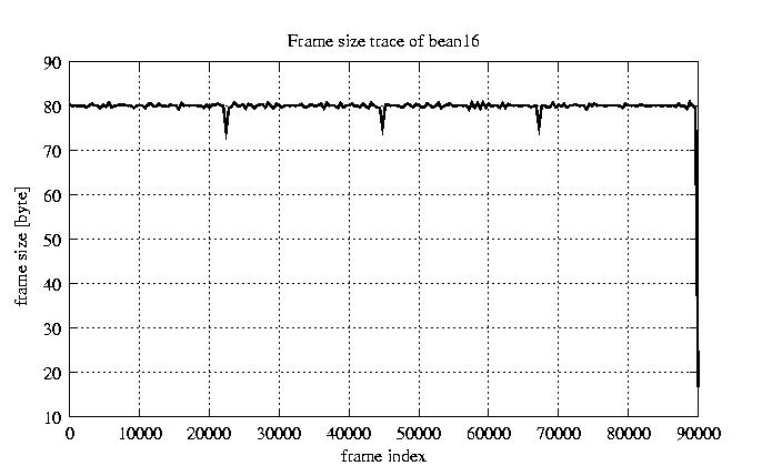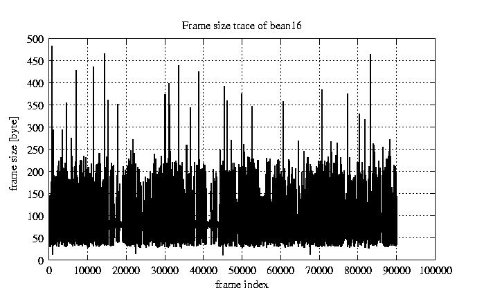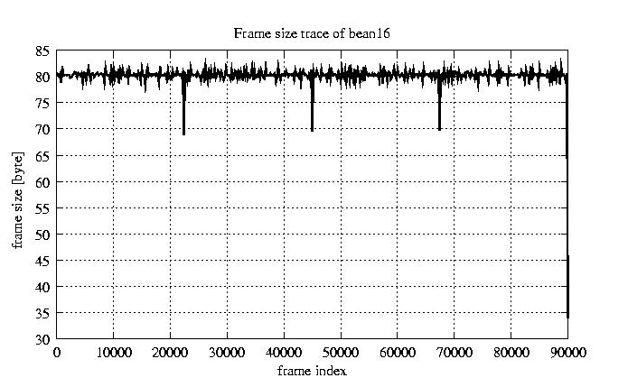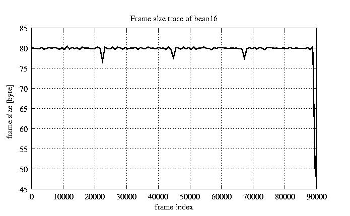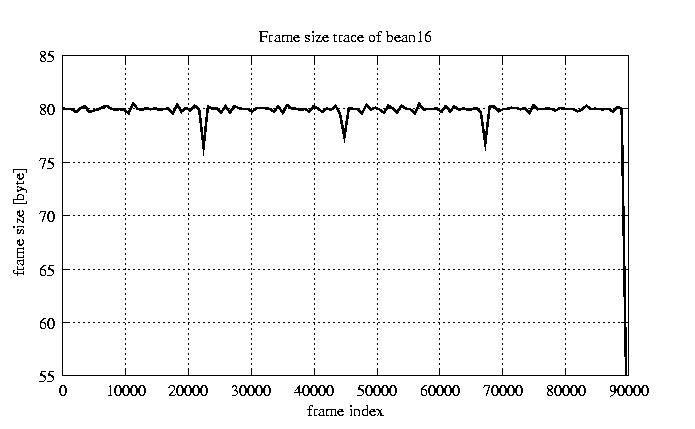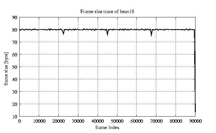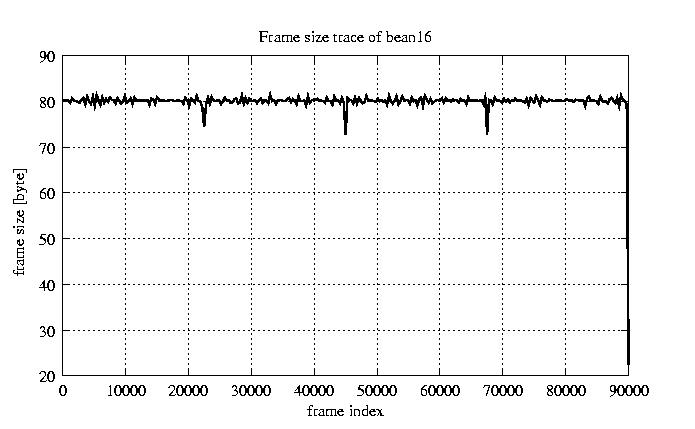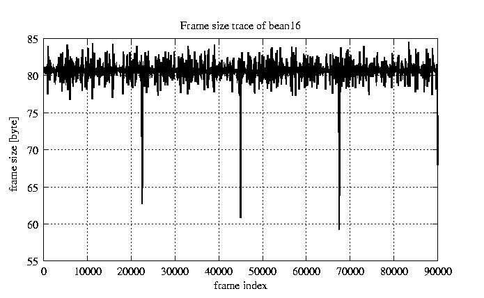 Frames, stuffed Rates Frames, original compression ratio YUV:H263 476.38 476.38 File size byte 7.2e+06 7.2e+06 Video run time msec 3.6e+06 3.6e+06 3.6e+06 # of Frames - 90085.00 17865.00 mean frame size byte 79.80 402.41 var frame size - 38576.50 64701.65 CoV of frame size - 2.46 0.63 min frame size byte 0.00 24.00 max frame size byte 3265.00 3265.00 Peak/Mean frame - 40.91 8.11 Mean bit rate bit/sec 1.6e+04 Peak bit rate bit/sec 9.7e+04 Peak/Mean of bit rate - 6.1 CoV of bit rate - 0.34 max inter frame space frames 1.00 40.00