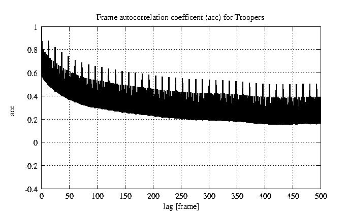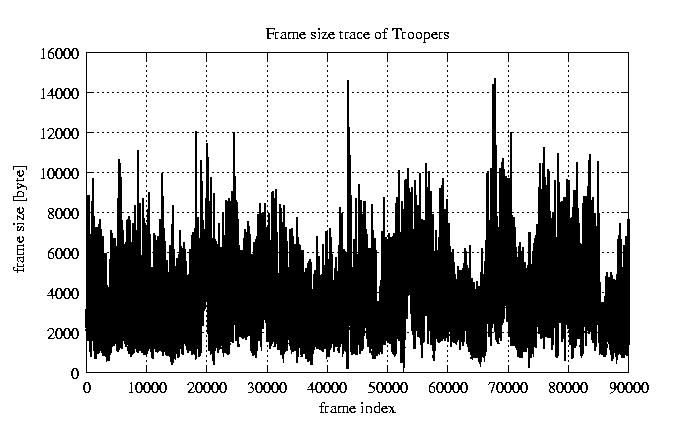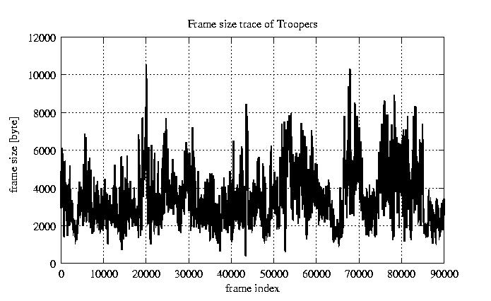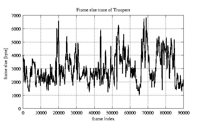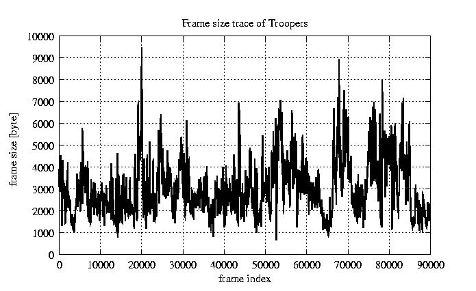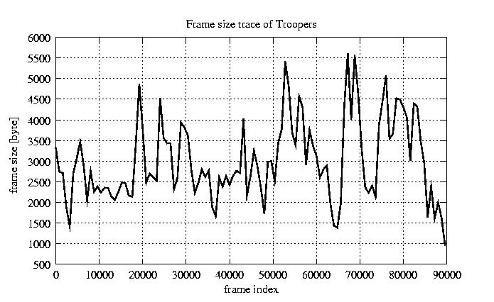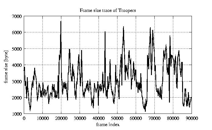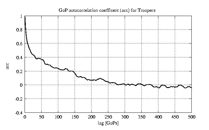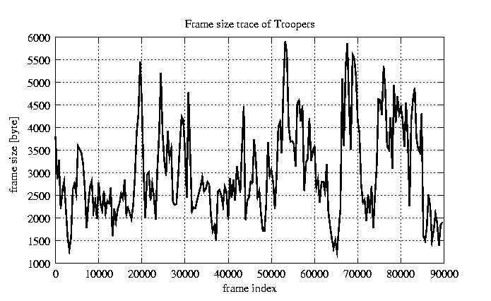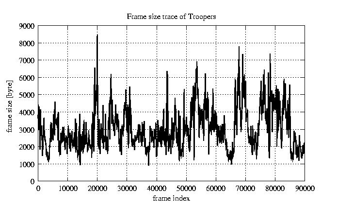 GoP statistics # of GoPs - 7499 mean GoP size byte 3.6e+04 var GoP size - 2.6e+08 CoV of GoP size - 0.44 min GoP size byte 4115 max GoP size byte 116757 Mean bit rate bit/sec 6e+05 Peak bit rate bit/sec 1.9e+06 Peak/Mean of bit rate - 3.23