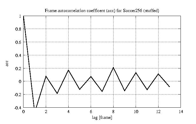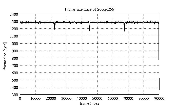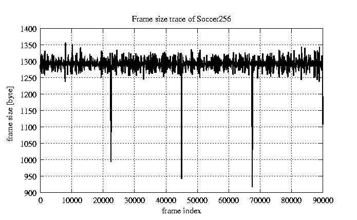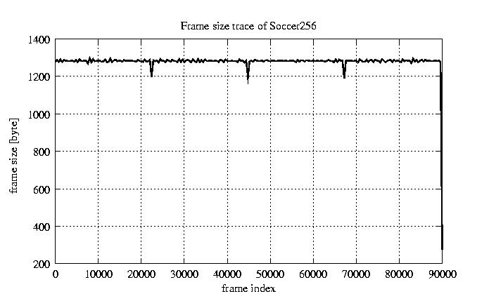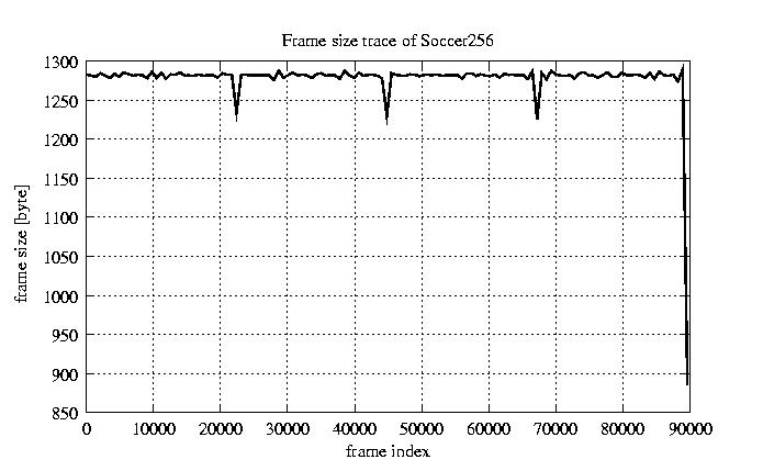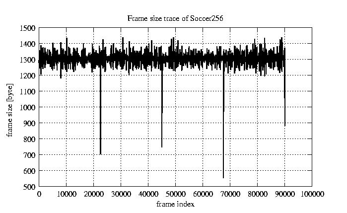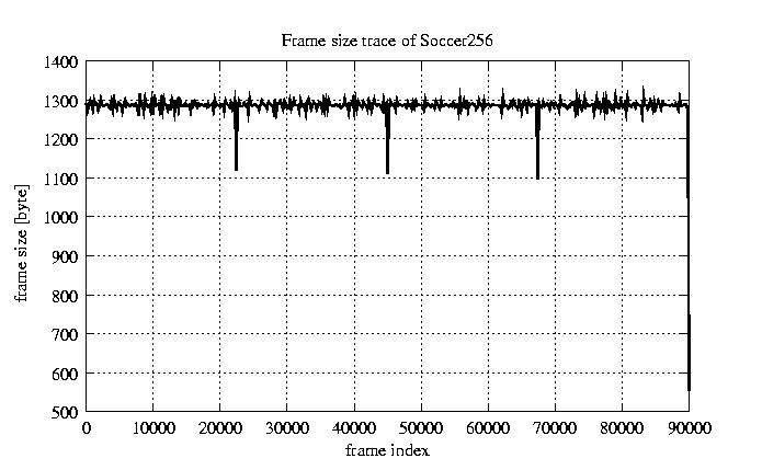 Frames, stuffed Rates Frames, original compression ratio YUV:H263 29.73 29.73 File size byte 1.2e+08 1.2e+08 Video run time msec 3.6e+06 3.6e+06 3.6e+06 # of Frames - 90083.00 33902.00 mean frame size byte 1278.76 3397.87 var frame size - 3308743.50 1591355.86 CoV of frame size - 1.42 0.37 min frame size byte 0.00 316.00 max frame size byte 11168.00 11168.00 Peak/Mean frame - 8.73 3.29 Mean bit rate bit/sec 2.6e+05 Peak bit rate bit/sec 1.5e+06 Peak/Mean of bit rate - 5.7 CoV of bit rate - 0.35 max inter frame space frames 1.00 33.00