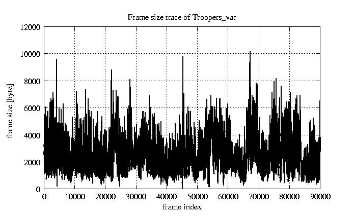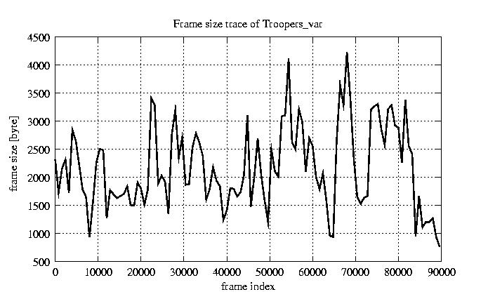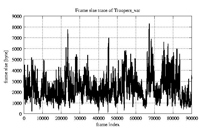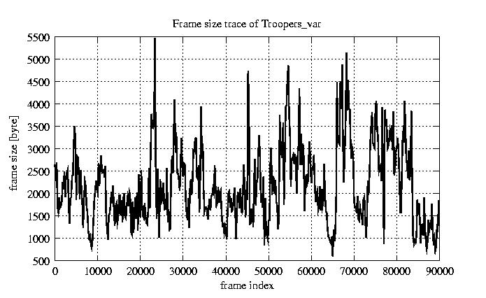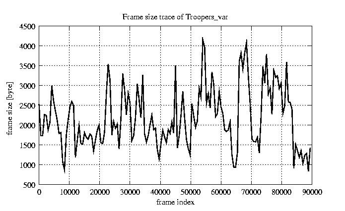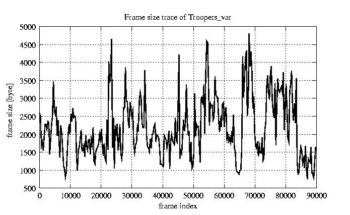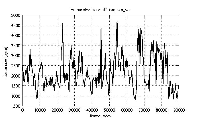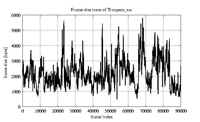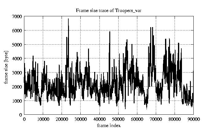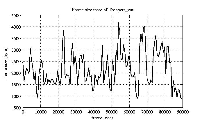 Frames Rates compression ratio YUV:H261 17.47 File size byte 2e+08 Video run time msec 3.6e+06 3.6e+06 # of Frames - 90000.00 mean frame size byte 2176.39 var frame size - 1192171.42 CoV of frame size - 0.50 min frame size byte 163.00 max frame size byte 10227.00 Peak/Mean frame - 4.70 Mean bit rate bit/sec 4.4e+05 Peak bit rate bit/sec 2e+06 Peak/Mean of bit rate - 4.7 CoV of bit rate - 0.5 max inter frame space frames 1.00